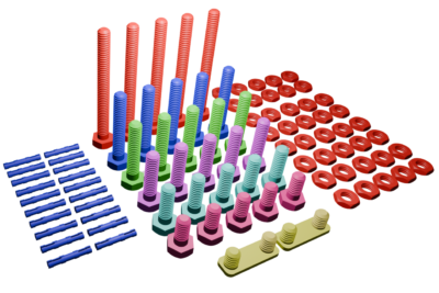 Lot de vis : 5 x 100 - 5 x 70 - 5 x 50 - 5x40 - 5x30 - 5 x20 - écrous x40 - goujons x20 - attaches x2