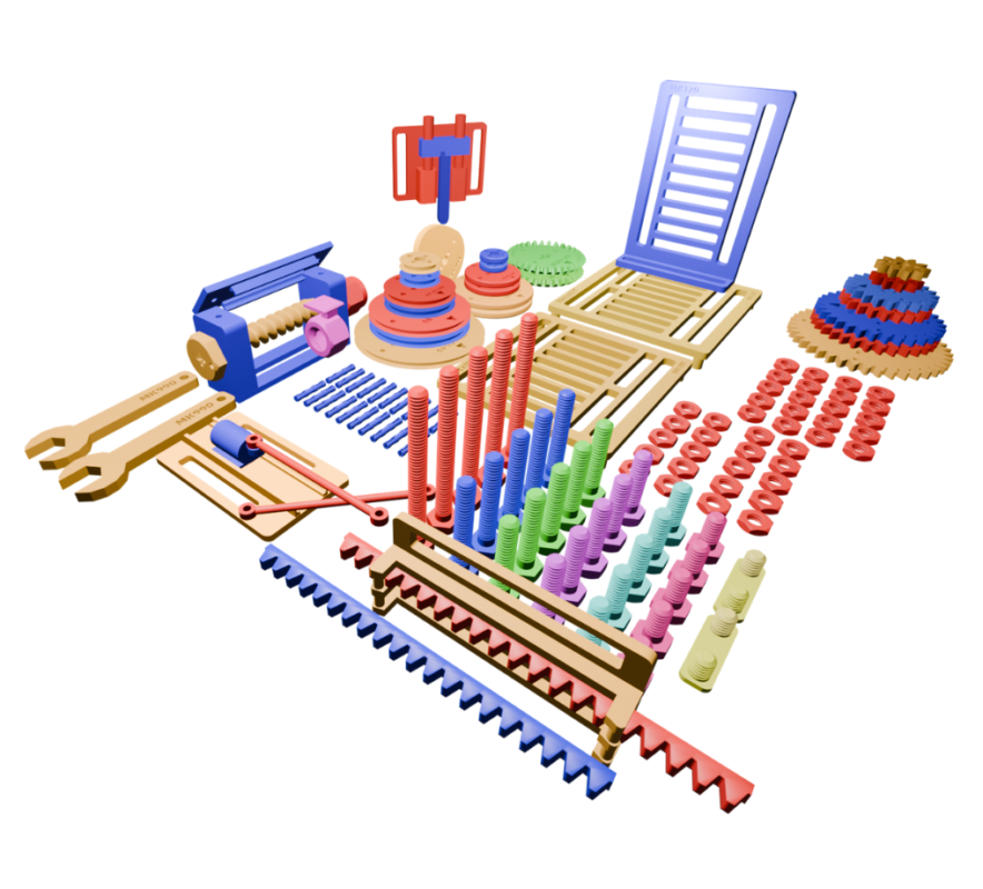 Le MécaKit est composé d’un ensemble de pièces mécaniques conçues pour être manipulées, assemblées et réutilisées facilement. Toutes les pièces sont durables, réutilisables et pensées pour l’expérimentation active.